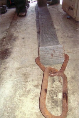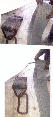 Ces courroies de levage ont 234 pouces de circonférence, 8 pouces de large et 5/8" d'épais. Les anneaux 15" x 7" pouces et 1¾" grosseur. Ils sont en acier. Ils peuvent servir pour déplacer de la matière très chaude où une courroies de levage en corde ordinaire brûlerait. Ces courroies peuvent être modifiées et servir à de multiple usages.