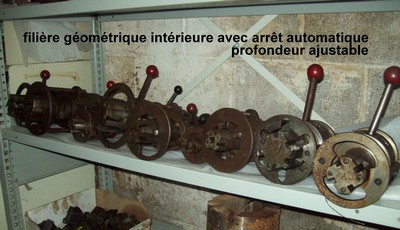 Un très grand nombre de filières à tuyaux de 1/8 pouces à 6 pouces. Manuelle et motorisée. J'ai de la géométrique avec arrêt automatique. J'ai aussi plusieurs têtes pour intérieur. Pour plus plus d'équipements qui servent au travail du métal, aller voir aussi items