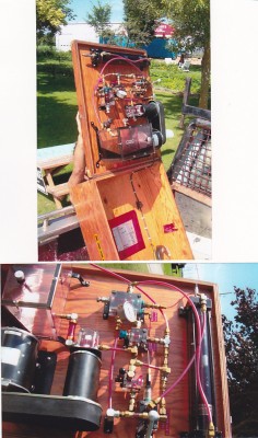 Dans la boite de bois, c'est un montage pour instructeur de métier pour aider a comprendre de quel manière circule les huiles hydrauliques dans un système où tout est transparent, même le cylindre. L'autre jaune est un ensemble de testeur de pompes de valves, de débit. Il faut qu'il soit accompagné d'une table de réserve d'huile et manutention . Tous les boyaux sont dans l'armoire.