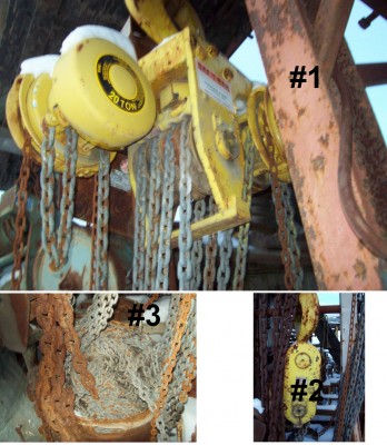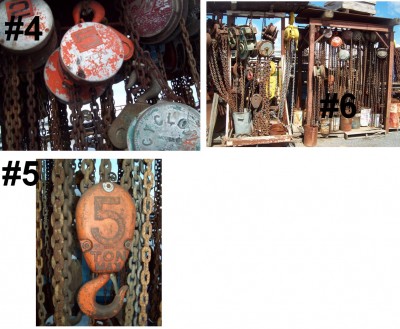 Un très gros lot de palan en inventaire. Manuel, 1 tonne à 20 tonne, de marques et qualité supérieure tels «cyclone», «Budgit», «Vulcan Hoist », « C.M ». Plusieurs de ces palans sont neuf et de modèle récent. Aussi, des aciens pas cher. Note #1: une tête de palan 20 tonnes. Note #2 : le crochet à 9 chaines. Note #3: les 9 chaines font un baril complet de chaines. Note#4: 1 tête de 5 tonnes. Note #5: Crochet 5 tonnes, 3 chaines.