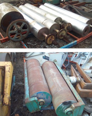 En inventaire, beaucoup de rouleaux à compactions. Ici, sont montrés des 14 à 16 pouces de diamètre lourds et légers. Quelques uns peuvent être remplient d'eau. de 30 pouces de long à 60 pouces de long. J'en ai aussi en stainless de 14 à 16 pouces. Aussi des rouleaux de convoyeurs non illustrés une tête de convoyeur 50 " X 36 " et le rouleau auto-nettoyeur. Aussi, en inventaire, j'ai des milliers de petits rouleaux de toutes sortes non illustrés.